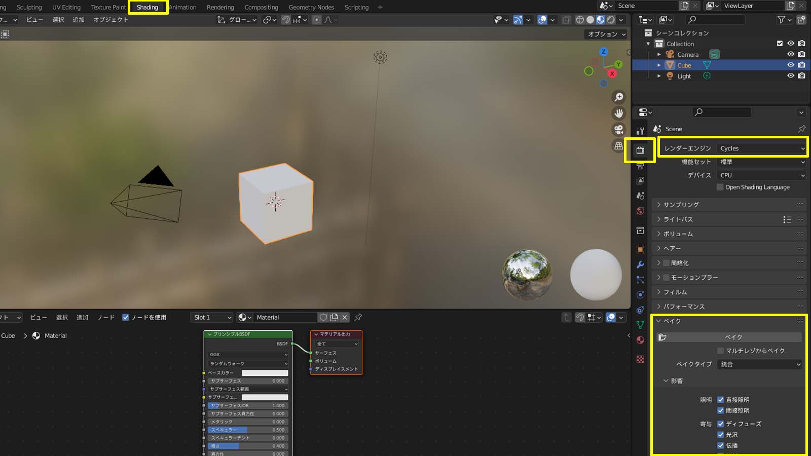 [ワークスペース]で[Shading]を選び、[レンダープロパティ]の[レンダーエンジン]を[Eevee]→[Cycles]に切り替える。